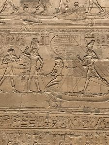 Outside on a wall is a wonderfully preserved battle relief of Horus battling his uncle, the god Set. Horus is the son of Osiris and Isis, Set is the brother of Osiris. Osiris and Set had a very interesting brother relationship, which resulted in Set trying to kill Osiris twice and being brought back to life by his Isis. This battle scene shows Osiris’ son, Horus defeating the god Set in his evil hippopotamus form. The hippo is defeated, but not before taking one of Horus’ eyes, which becomes know as the Egyptian wadjat eye, which is a symbol of protection.
