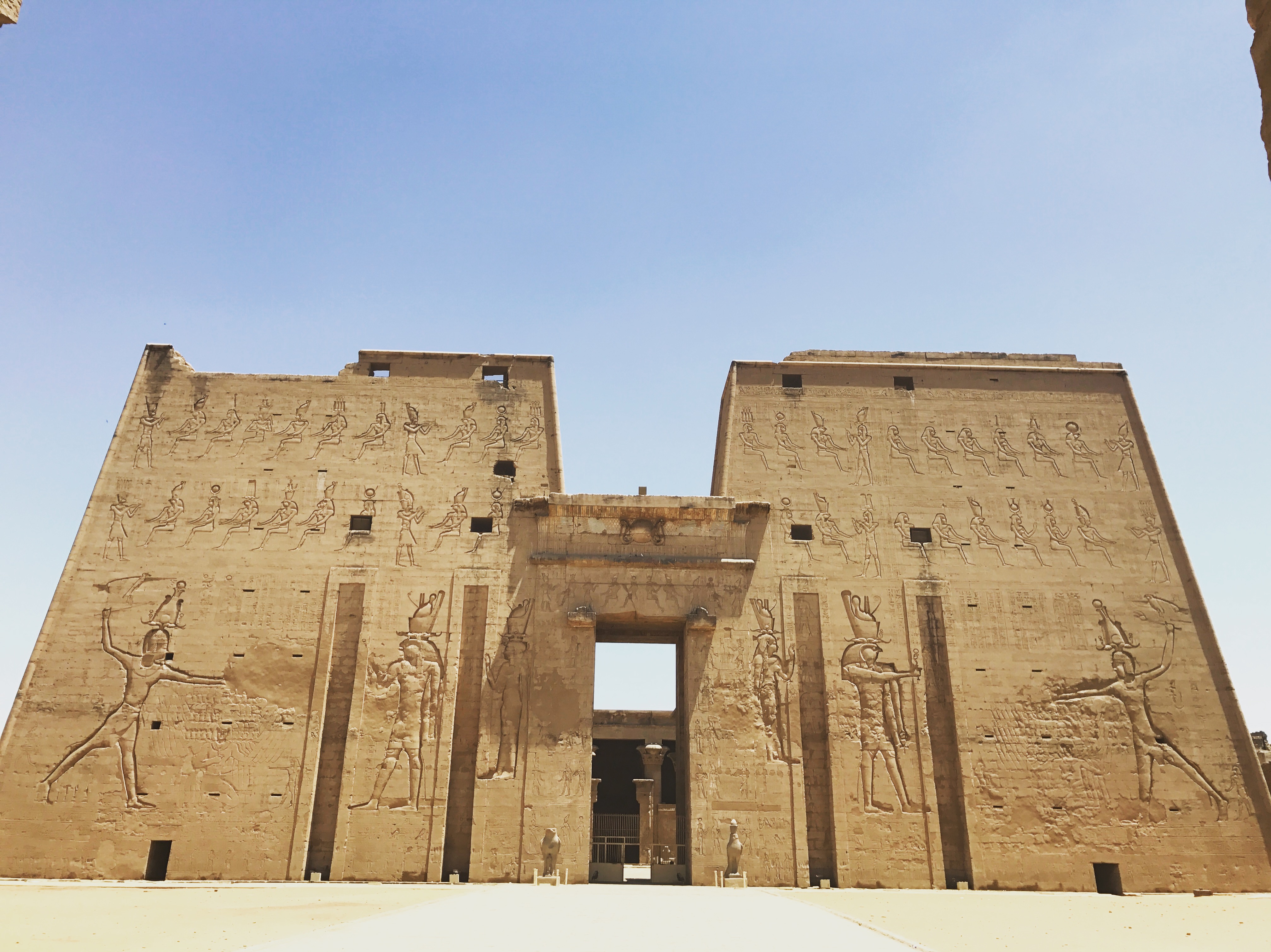 The temple is know throughout Egypt as being the most intact temple. The structure, including the facade walls were covered in sand, hidden from the world. The sand actually helped the preservation of the reliefs and outer walls of the temple. The reliefs inside didn’t hold their colors as well as at Dendera, but the actual reliefs were better preserved. At most of the temples throughout Egypt some of the gods and pharaohs faces would be smashed off by the Christians and Muslim people because these gods were seen as false.
